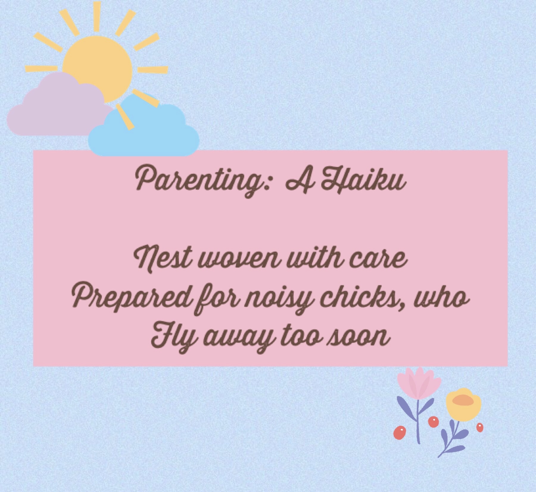 What brought on these notions concerning nests? It certainly could not be the fact that our youngest graduates high school in less than a month. 😉 We feel the empty nest rapidly approaching. So before our flurry of activities has come and gone, here is a little poem from this mama bird.